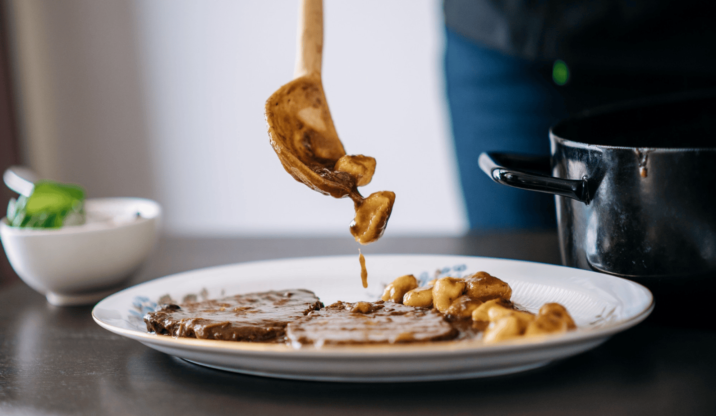 Cut of beef meat called frikando. Served with gnocchi.