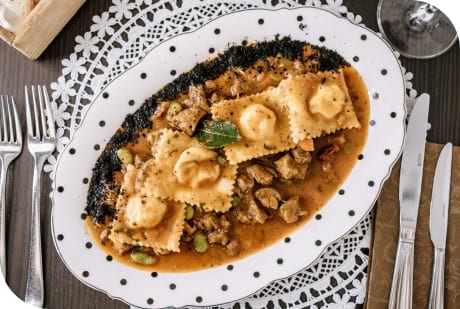 Lamb and tomato ragout with homemade cheese ravioli.