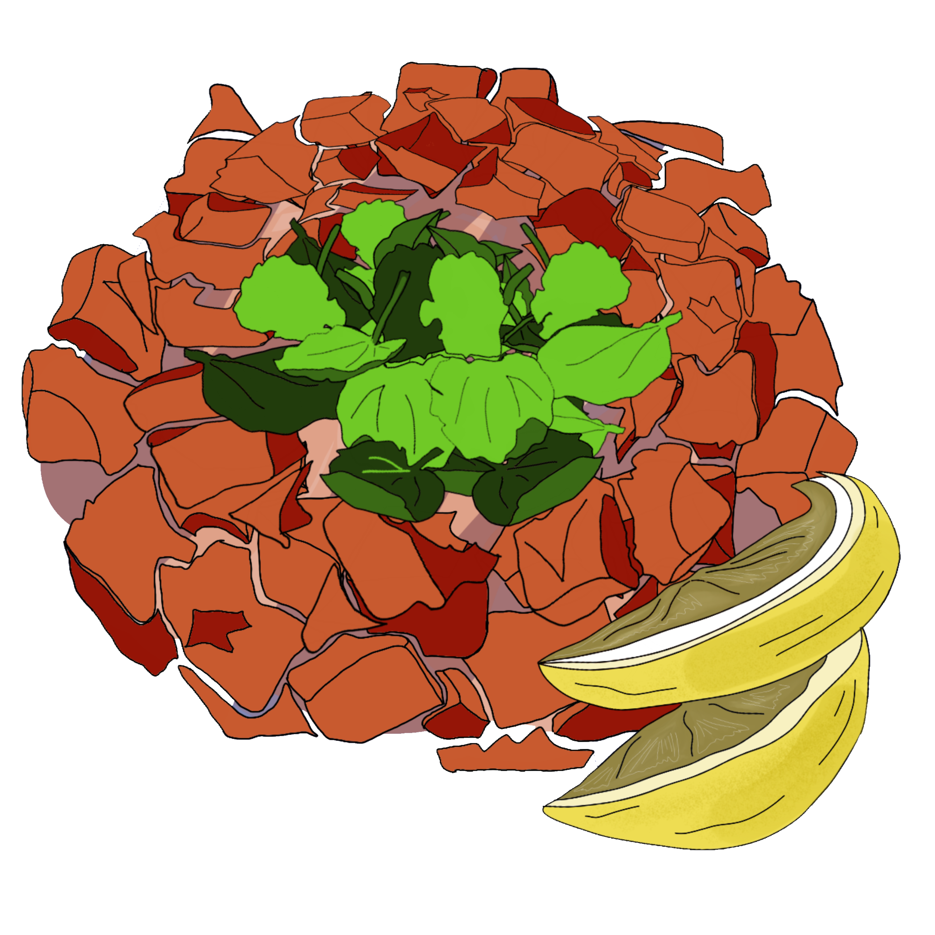 Blue crab shell, blue crab meat, pasta, tomato sauce.